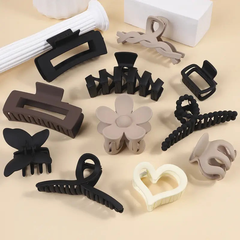 This 8-piece claw clip set has a clip for every occasion, mood, and setting—be it the workplace, college, or a fun day out. The set includes a mix of soft neutral tones like ivory, brown, cream, white, beige, and black, making them versatile for all outfits. From elegant designs like matte geometrical clips and to fun shapes like a daisy, butterfly, and heart, there's something for every vibe. Whether you're going for chic and polished or cute and casual, this set has the perfect clip to